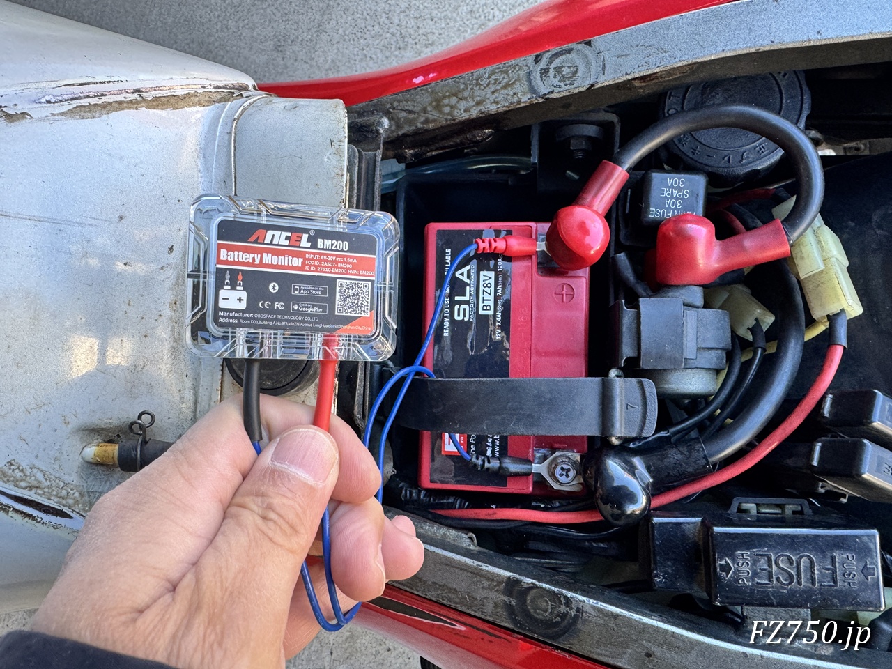 FZ750のバッテリー端子を緩めて、MB200の端子を締めるだけです。ショートしないようにプラス側の端子から作業を行うなど注意は必要ですが、そこまで難しい作業ではありません。