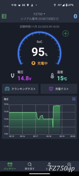 9時18分過ぎに2回目のセルでエンジン始動。エンジン始動後は電圧14.8Vぐらい。