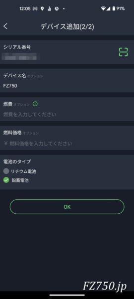 電池タイプを適切に設定します。デバイス名(車両名)などの任意項目も入力したら、「OK」をクリックします。以上で初期設定は完了です。