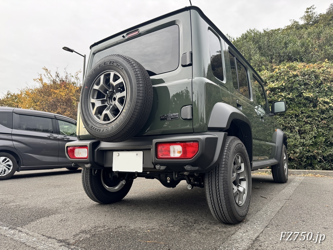 ジムニーノマドのスペアタイヤを純正アルミホイールに交換すると、後ろ姿も精悍な雰囲気になりましたね。
