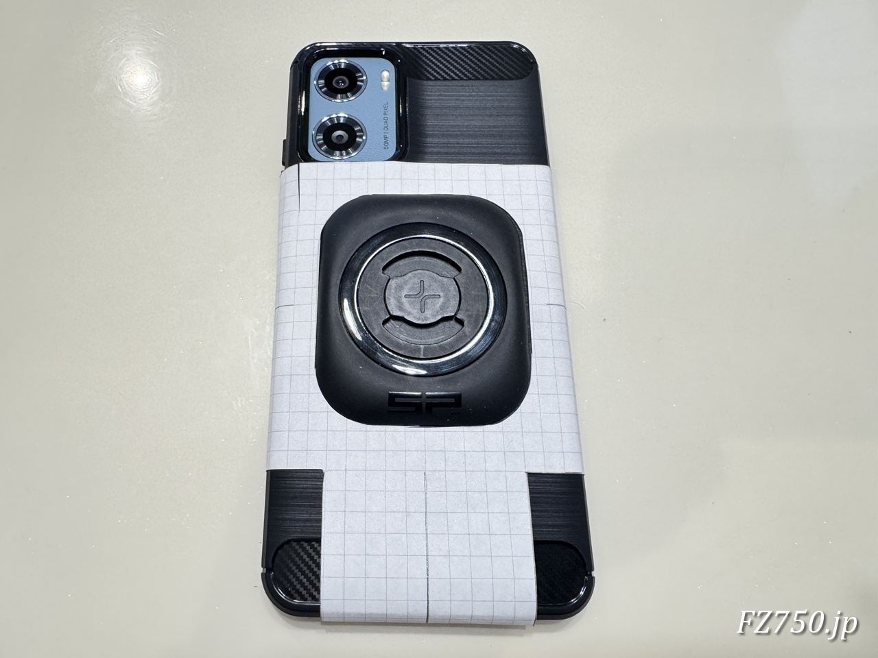 旧スマホで使用していたSP CONNECTの「ユニバーサルインターフェイス SPC+」を剥がして、両面テープの貼り付きがよいTPU(熱可塑性ポリウレタンエラストマー)のケースに超強力両面テープで固定しました。