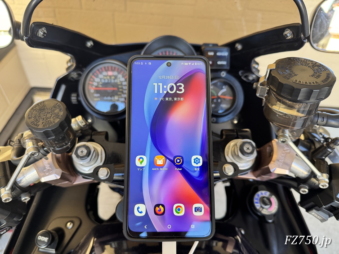 私のオートバイ(FZ750)では、「SP CONNECT」を用いて、トップブリッジにスマホを固定しています。