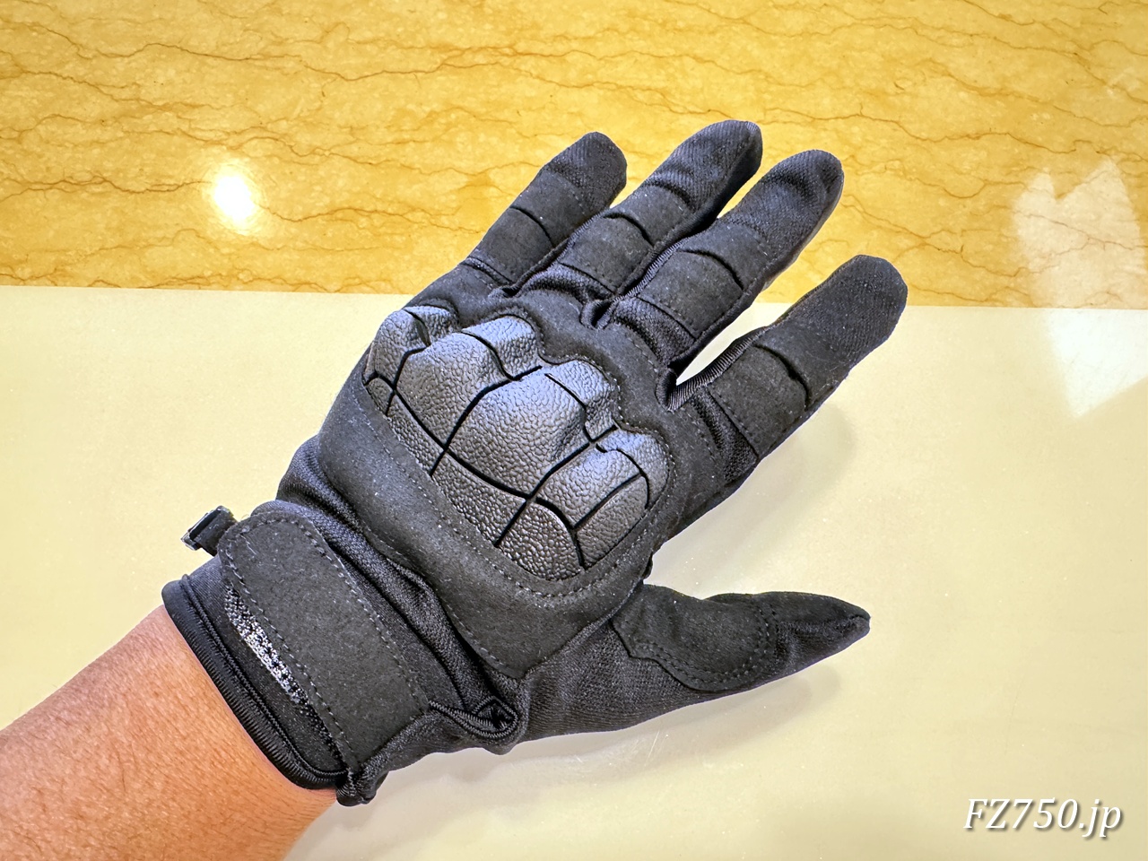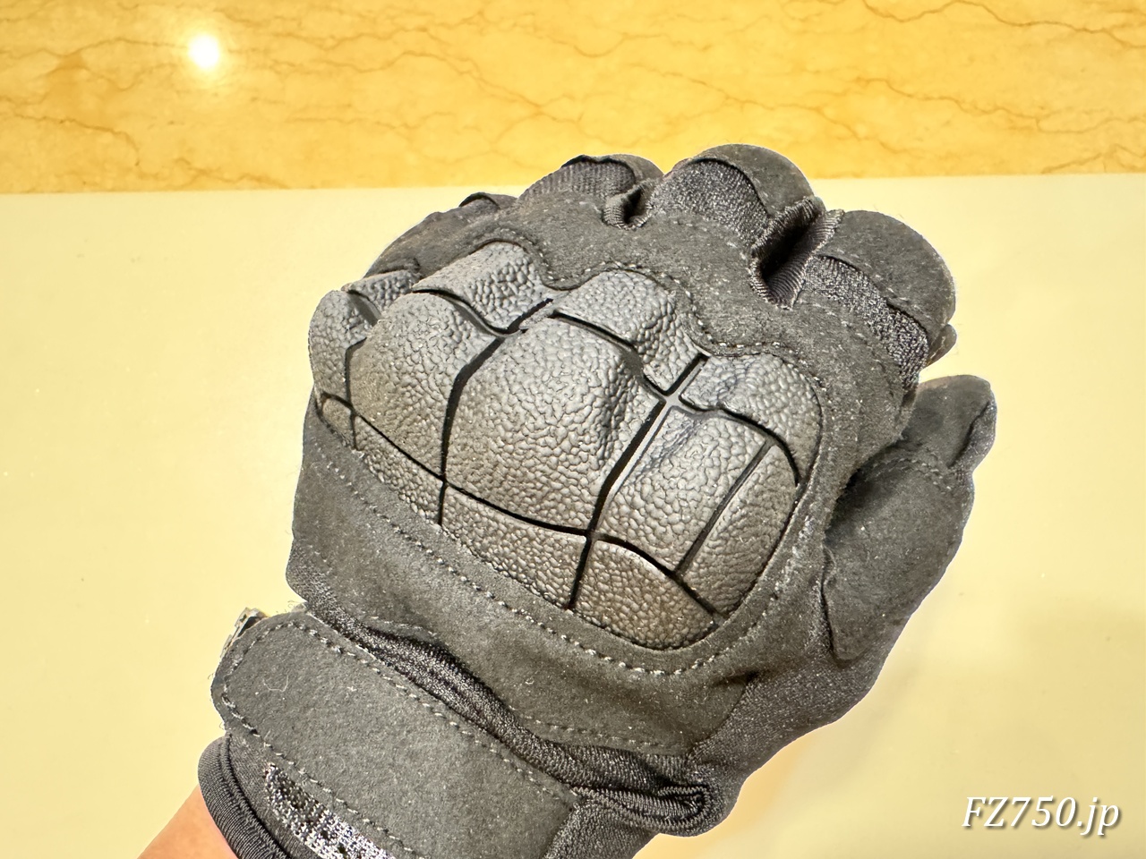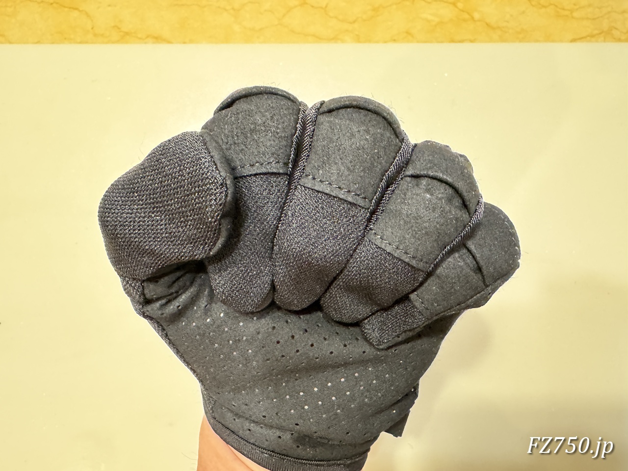 プロテクターはブロック状に分割された構造で、グーを握った際にもプロテクターが手の形に自然に追従します。素材・形状ともに大きな変化はなく、手の甲への衝撃・摩擦保護という基本機能はしっかり確保されています。
