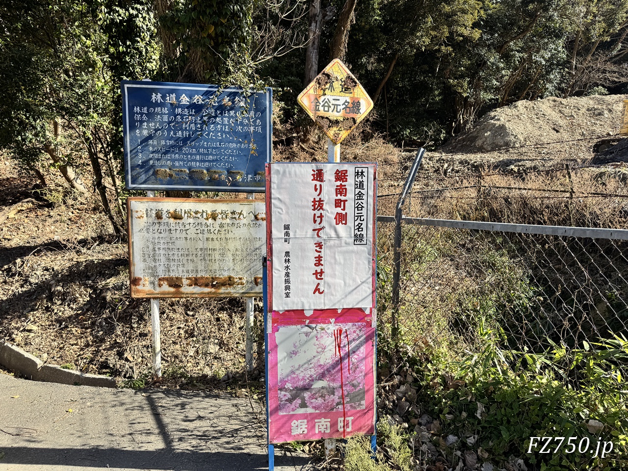 林道金谷元名線の起点には「鋸南町側通り抜けできません」の看板