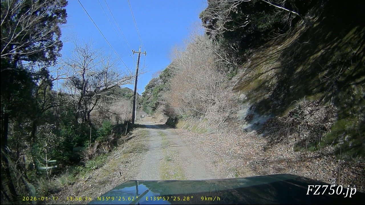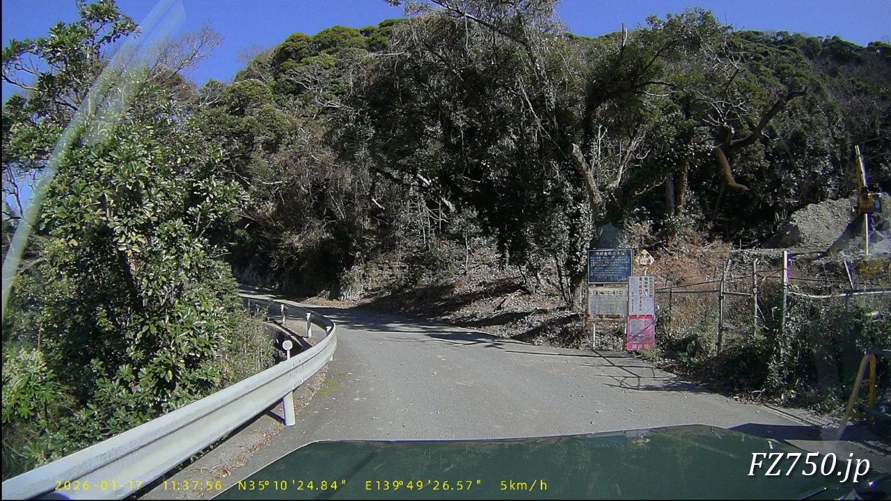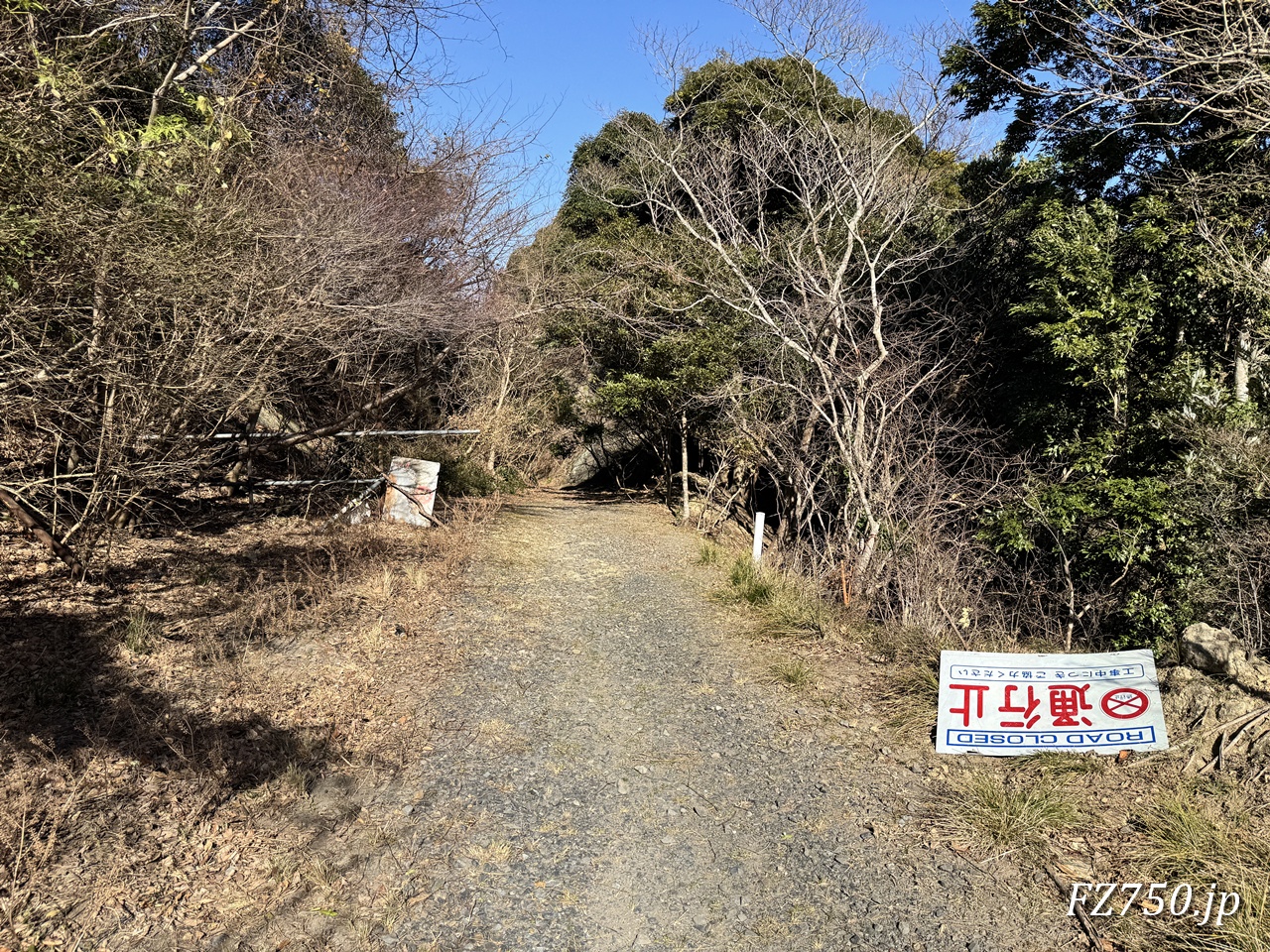 林道金谷元名線は始点からおよそ5kmの地点の「林道南房総金谷元名線 開通記念碑」のところで通行止めでした。(2026年1月17日時点)