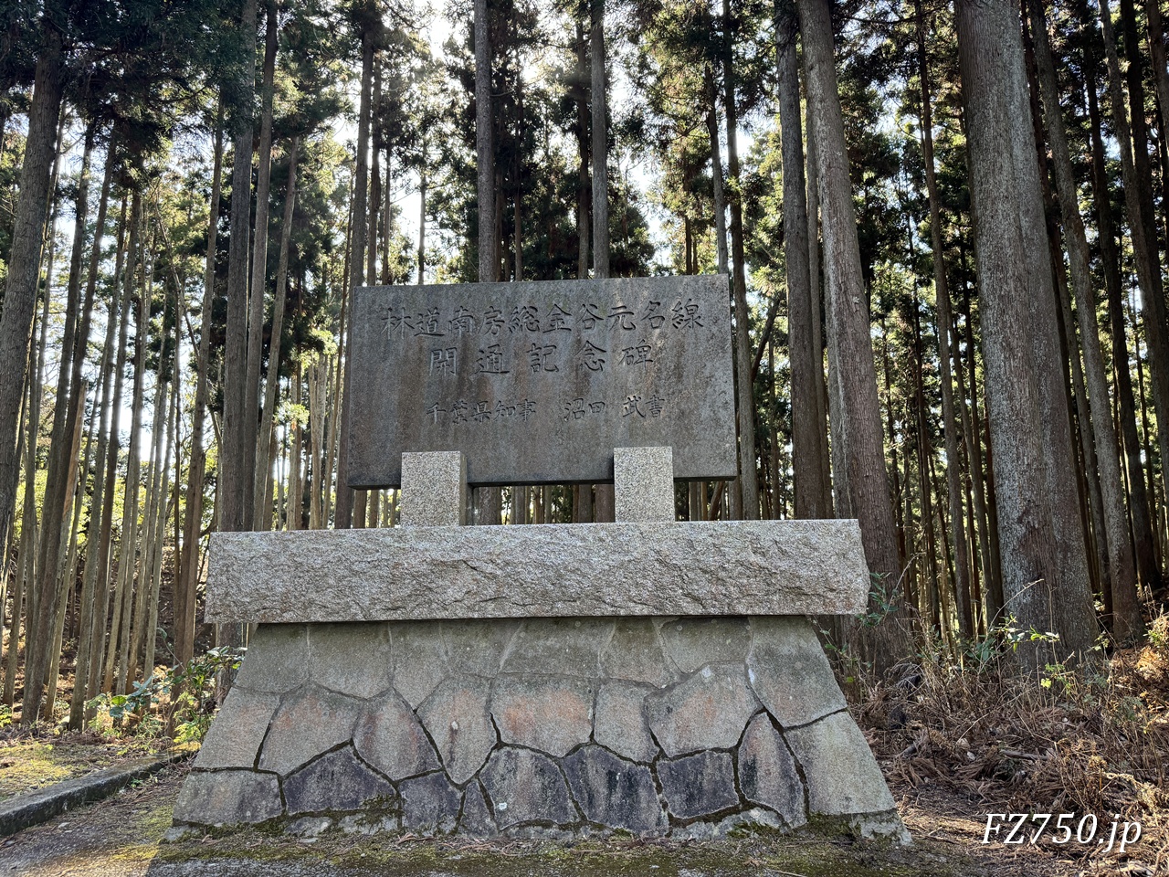 通行止めのバリケードの右側には、「林道南房総金谷元名線 開通記念碑」があります。他の林道でも開通記念碑はみたことがありますが、ここまで立派な林道開通記念碑も珍しい感じがしますね。
