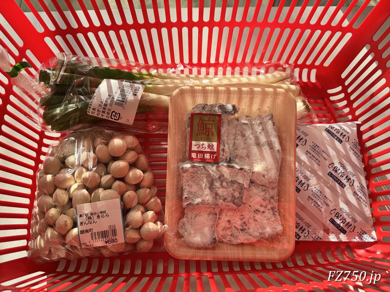 道の駅 保田小学校で購入した、つちクジラの竜田揚げ、ねぎ、ぎんなん